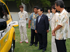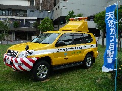 この車両は、天然ガス(CNG)とガソリンの2種類の燃料を使用できるバイフューエル車で、環境に優しい天然ガス自動車の導入促進のPRを行いました。