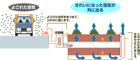 土の中には空気のよごれをすいとってきれいにする小さな生き物がいます。この力を使って車の排気(はいき)ガスなどでよごれた空気が、どれくらいきれいになるかためしています。