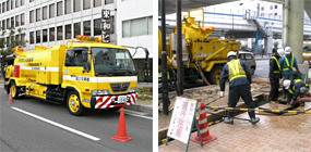 道路のミゾやパイプの中のゴミを、ジェット水りゅうであらい流してすいこみ、きれいにそうじします。