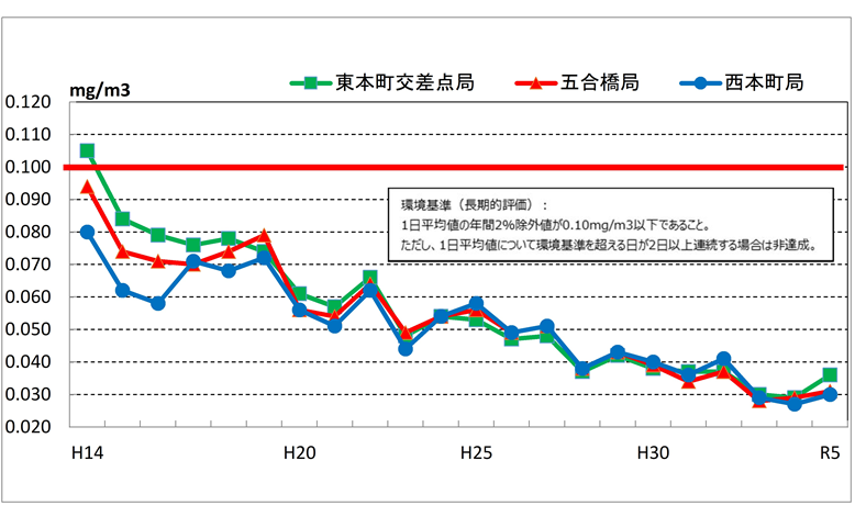 【尼崎市】国道43号 浮遊粒子状物質(SPM)日平均値の2%除外値の経年変化