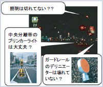 夜は暗く、視界が悪くなります。夜間交通の安全を確保するため、照明設備、視線誘導標(デリニエーター)の反射状況、視認性等を確認します。