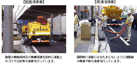 路面や道路付属物(遮音壁・歩道橋)、排水施設(側溝・集水桝)の清掃などによって、道路の機能・環境を保持することにより、安全・安心な道路を提供しています。