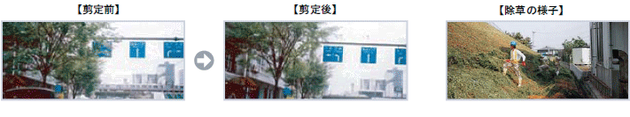 伸びすぎて信号や標識が見えにくくなったり、照明が隠れてしまったりした街路樹の剪定や、法面の除草などもしています。