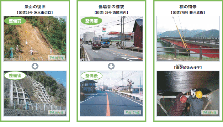 パトロール、点検を通じて確認した、構造物、付属物の損傷、老朽化など機能低下に対処します。低騒音舗装など車道の修繕、耐震性の強化、車両の大型化に対応した橋梁・橋脚の補強、交通安全施設の更新、法面の防災対策などにも取り組んでいます。