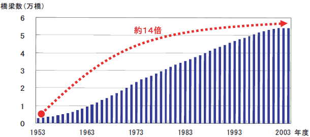 日本では、高度成長期に多くの道路ストックが形成され、今後これらの道路ストックが高齢化していきます。 例えば、道路の橋梁は、1950年代から整備が進み、現在では、橋梁数が当時の約14倍になっています。建設後50年以上が経過する高齢化した道路施設が今後急増し、補修を必要とする道路施設が増えていくことが懸念されます。 日本よりも30年早い1980年代に多くの道路施設が高齢化した米国では、平成19年8月、ミネソタ州ミネアポリスでミシシッピ川にかかる高速道路の橋(片側4車線・全長約150メートル)が崩落しました。この橋は、建造から40年を経過しており、一日の交通量は20万台に達するほど利用されていました。崩落が起きたとき、橋の補修工事が行われていましたが、こうした大惨事が起こる前に日々の点検で橋の損傷を発見し補修する必要があります。