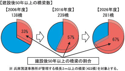 兵庫国道事務所が管理する橋梁585箇所(2m以上)のうち、約33%が50年以上前に建設されており、今後、疲労や劣化等の損傷が深刻になることが懸念されます。今後、高齢化した道路ストックが急増することを踏まえ、損傷が深刻化してから対策を行う事後保全から、定期点検により早期に損傷を発見し、事故や架け替え、大規模な修繕に至る前に対策を行う予防保全に転換し、橋梁の長寿命化を推進します。