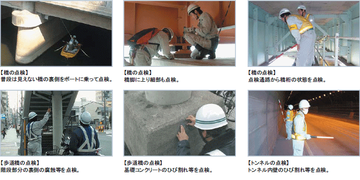 路面の舗装、道路構造物、共同溝や、遮音壁、標識、ガードレール、防護柵、照明などの道路付属物の状態を定期点検によって点検調査を行います。