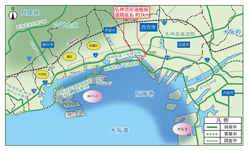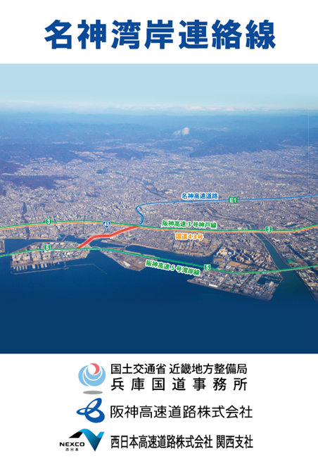 名神湾岸連絡線は、名神高速道路、阪神高速3号神戸線(大阪方面)及び阪神高速5号湾岸線を連絡し、阪神高速3号神戸線と国道43号に集中している交通を阪神高速5号湾岸線に分散させることにより、周辺地域の交通渋滞の解消や交通安全、沿道環境の改善を図ります。また、名神高速道路と阪神港をスムーズに連絡し、物流ネットワークの形成を図ります。
