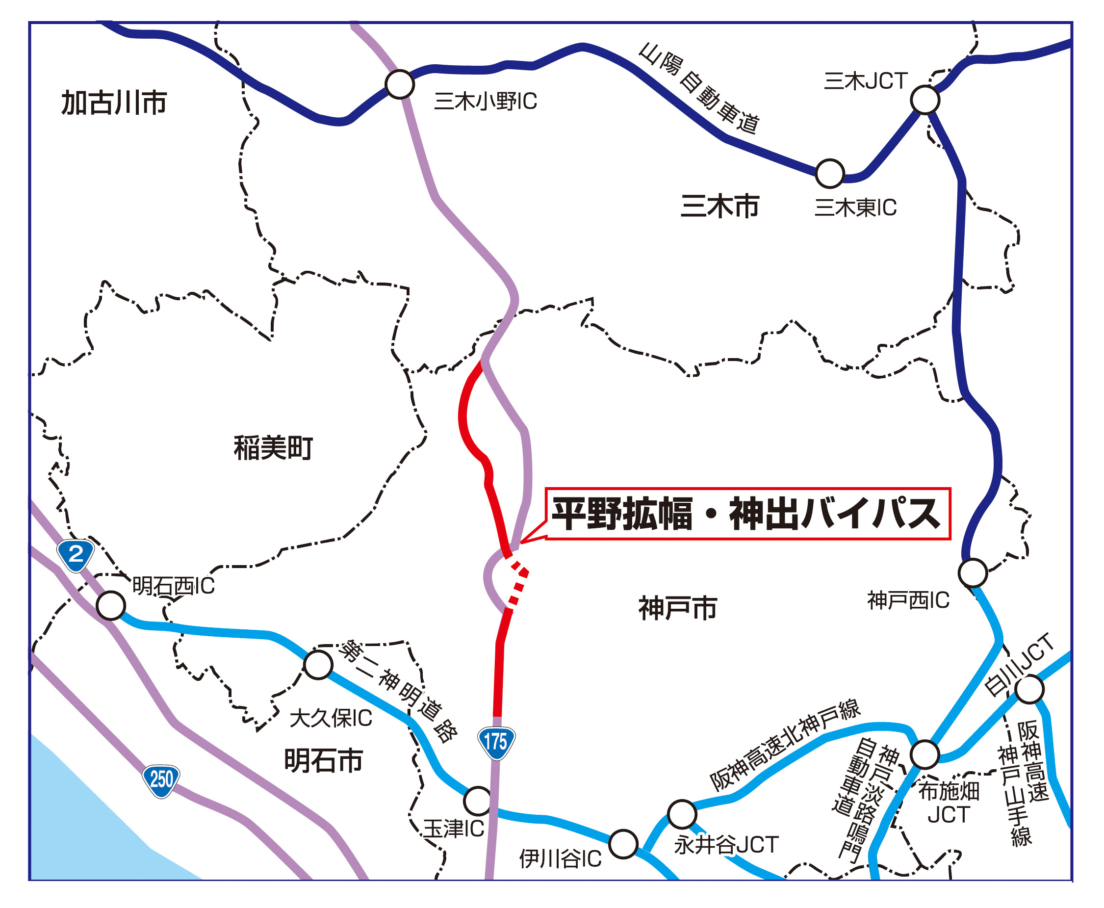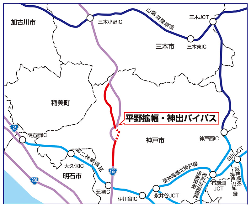 国道175号は明石市から、神戸市西区・三木市・西脇市など東播磨内陸地域を通り、京都府舞鶴市まで続く約129kmの幹線道路です。瀬戸内海臨海と舞鶴港を結び、中国縦貫自動車道、山陽自動車道、第二神明道路などをつなぐ、重要な役割を担っています。しかし、幅の狭いところや交通量が集中するところでは交通混雑が発生し、移動にかなりの時間がかかります。そこで、道路の幅を広げて車線を増やす「平野拡幅」、交通量を分散させる「神出バイパス」の改築事業により、移動時間を短縮し、スピーディに走れることを可能とします。