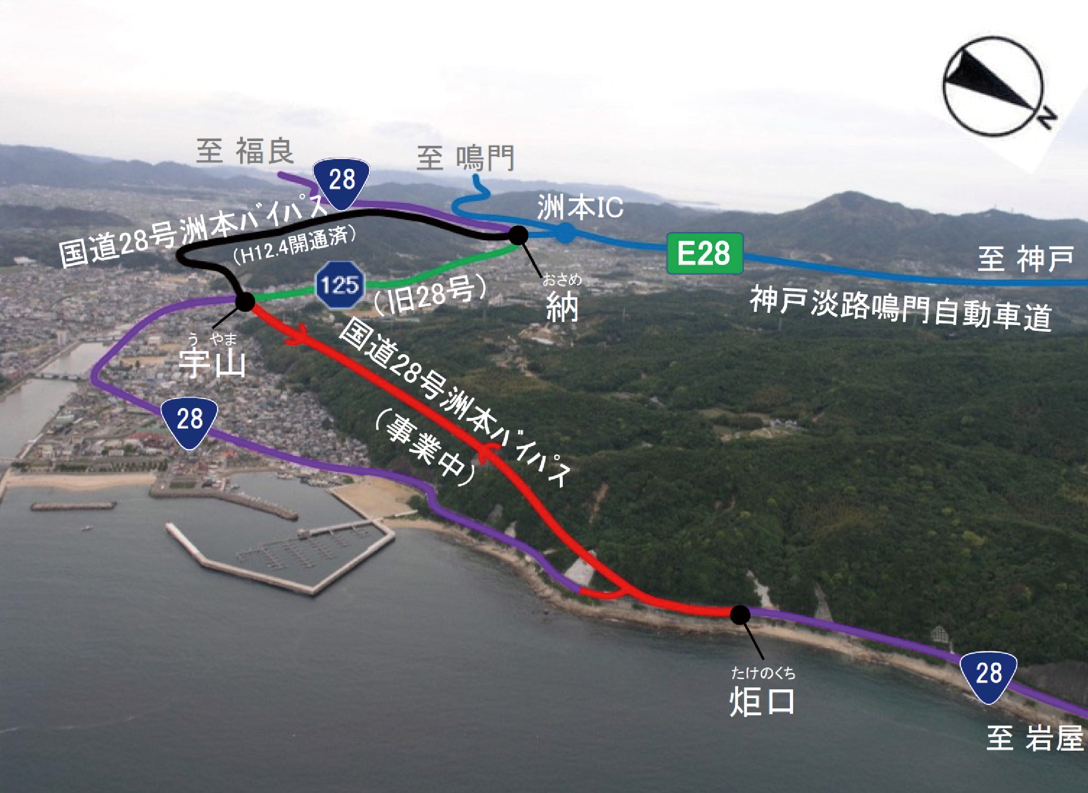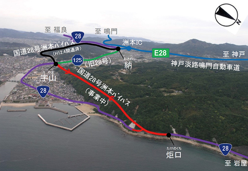 国道28号は、本州と四国を結び、古くから重要な役割を果たしている幹線道路です。神戸市中央区から、明石市・淡路島内・鳴門市を通って徳島市まで、その全長は195kmあります。神戸淡路鳴門自動車道の開通後も、地域の産業経済や住民の生活を支える大切な道路です。しかし、洲本市の中心部では交通が集中し、深刻な渋滞を引き起こしています。そこで、洲本バイパスを整備することにより、洲本市街地の通過交通を分散し、交通安全の確保を図ります。また、市街地と神戸淡路鳴門自動車道へのアクセス向上も期待されます。現在、洲本市納~宇山間3.6kmが開通し、残りの宇山~炬口間2.4kmの早期開通をめざしています。