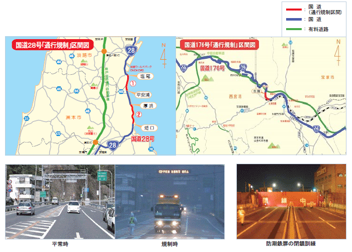 国道28号、176号では、大雨・台風・大雪・地震などのとき、道路を利用される皆様の安全を守るために「通行止」などの通行規制を行う場合があります。右表のとおり、連続降雨量に応じた通行規制区間を設定し、自然災害から地域の安全を守ります。