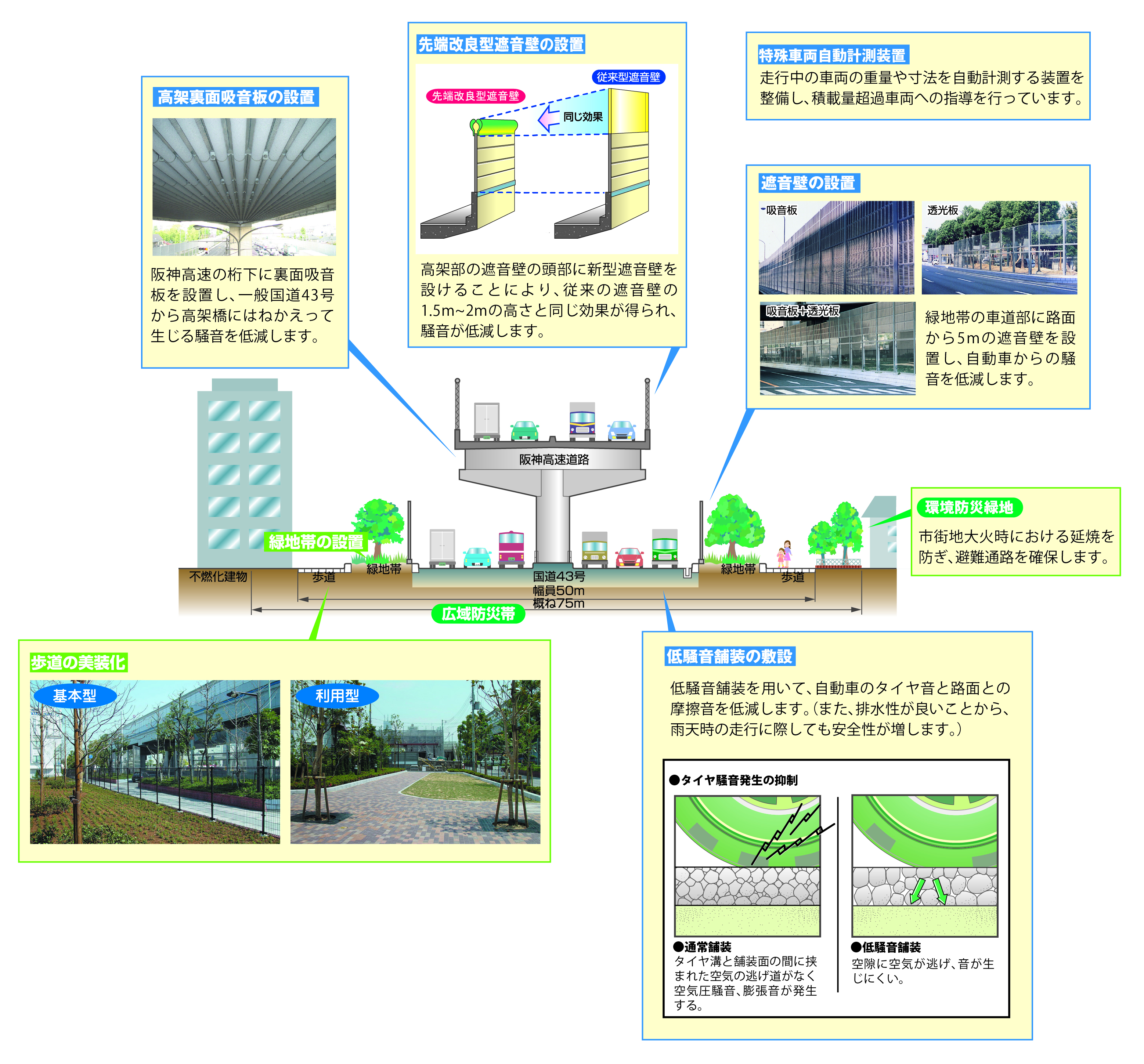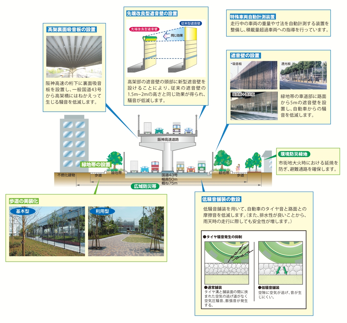 交通量が多い国道43号では沿道環境を改善するため、違反車両に警告を出す特殊車両システムなどを設置するほか、沿道緑地の整備や音で音を小さくする遮音壁など、人とまちにやさしい環境対策を実施しています。これからも環境改善につながる取り組みを推進します。