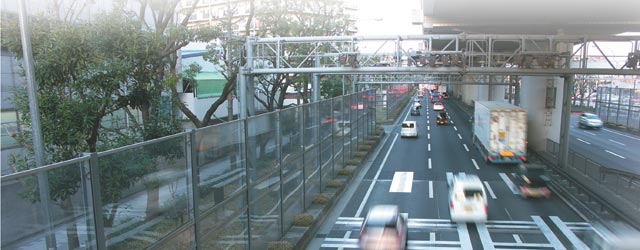 緑地帯の車道側への遮音壁、高架部の頭部への新型遮音壁、高架裏面の桁下への吸音板などの設置により、騒音低減効果が得られます。また、路面に低騒音舗装を用いるなど、総合的に騒音対策を強化することで生活環境の改善を図っています。