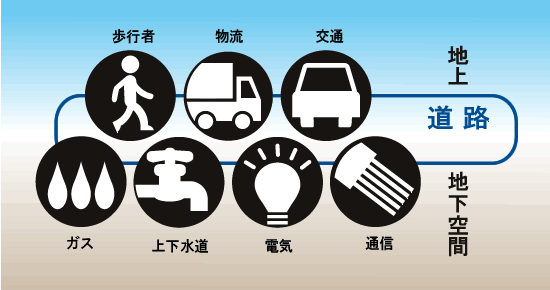 道路機能には、歩行者や自動車のための交通機能のほかに、快適かつ安全な国民生活にとって必要な公益施設(水道・電気・ガスなどのライフライン)の収容空間としての役割があります。