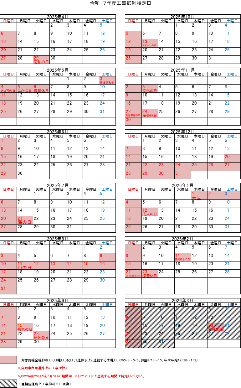 交通に影響のあるイベント・休日等を、工事を抑制する「特定日」とします。 令和7年度については、下記に示す特定日カレンダーにもとづき、工事抑制を実施します。