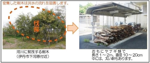 猪名川及び藻川に自然に繁茂した樹木は、洪水時の流れの妨げになるなど、河川管理上支障になることから、伐採しています。