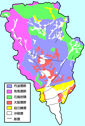| 地質 | 岩類・段丘層・酸性火山岩(有馬層群)・丹波帯・超丹波帯・大阪層群・沖積層の7つからなっている。 |