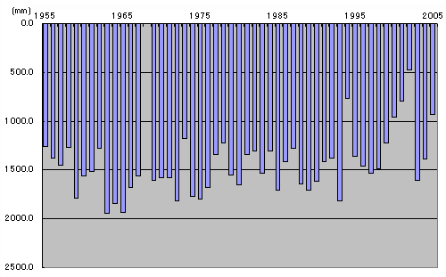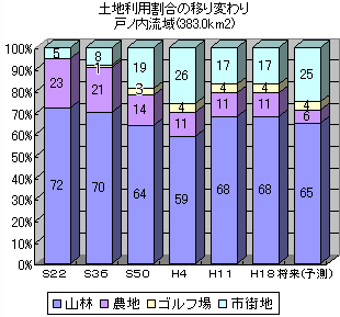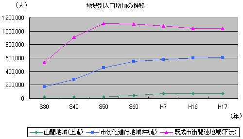 流域内の資産密度・人口密度は著しく高く、また水源地域まで住宅団地・ゴルフ場などの開発がすすみつつあるため保水機能や遊水機能が低下し、豪雨の際の洪水量の増大及び流出時間が非常に早くなってきています。