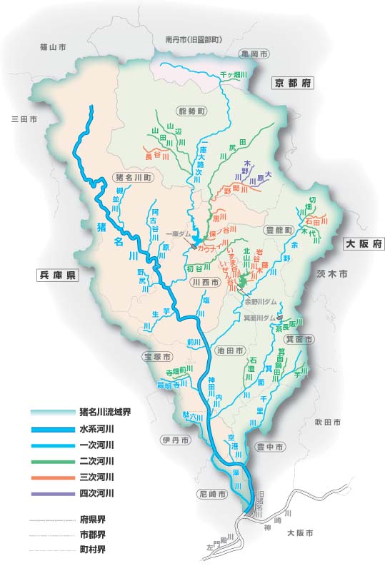 川西市・池田市・宝塚市・箕面市など多くの都市郡を擁し、また東西の拠点を結ぶ交通機関の集中や、大小約6,000の工場が立地している典型的な都市河川です。