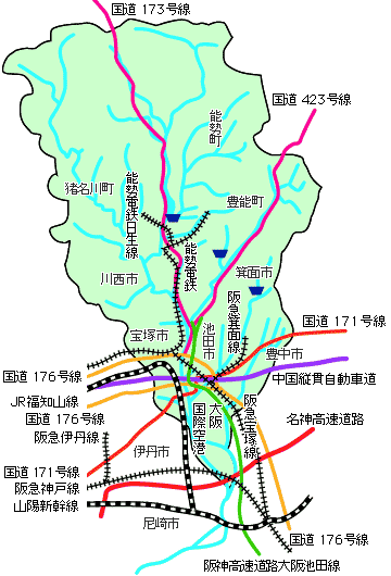 流域には川西市・池田市・宝塚市・箕面市・伊丹市・豊中市・尼崎市など多くの都市があり、東西拠点を結ぶ交通機関も集中していて、大小約6,000の工場が林立しています。