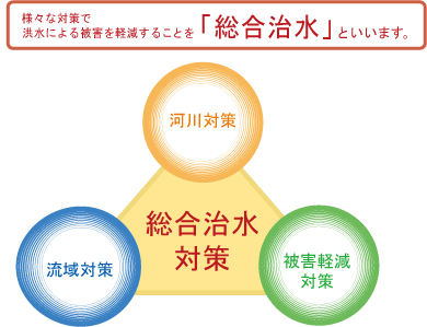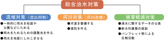 | 流域対策 | 保水地域の整備 : 現在保有している保水機能をできる限り保全します。やむを得ず開発する場合は、 調節池等の雨水貯留施設の整備を行い、開発による流量増を抑制します。 遊水地域の整備 : 盛土の抑制等を行い現在有している遊水機能の保全に努めます。 低地地域の整備 : 浸水被害の軽減を図るために必要な河川の整備を行います。 |