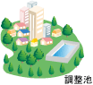 大規模な宅地開発が行われた開発地区内に調整池を作り、降った雨を一時的にためたあと、徐々に川へ流します。