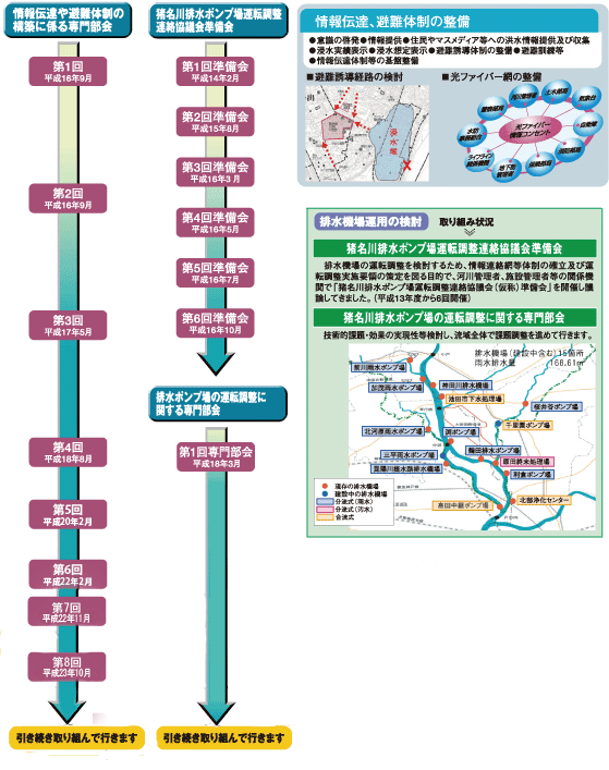 猪名川流域総合治水対策協議会のなかに情報伝達や避難体制の構築にかかる専門部会と、排水ポンプ場の運転調整に関する専門部会を設けて検討を進めています。