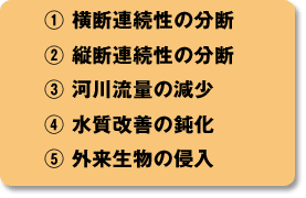 縦断連続性の分断は、魚類等の遡上・降下への影響が懸念される。特に回遊性魚類の生活史を確保するために、早急な取り組みが必要である。