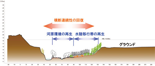 そのため、現在干陸化している砂州を切り下げることにより人工的に裸地環境や水陸移行帯を再生するとともに、冠水頻度及び洪水時の掃流力を増大させることにより自然の営力により河原環境の維持を図っていく。