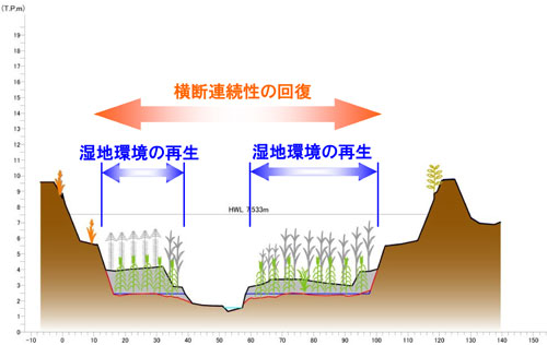 そのため、現状において湿地環境を有している箇所については保全を図っていくとともに、既に消失してしまった箇所については河川改修(掘削)の際に、治水安全度の確保や現在の高水敷の利用状況に配慮したうえで、水際部を緩い横断勾配で掘削、造成することにより、湿地および水陸移行帯の再生・創出する。