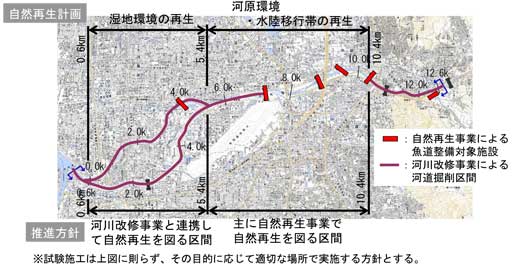 - 河川改修において大規模な河道掘削が予定されており、さらにその掘削により当該区間で目標としている自然環境の再生が達成できる場合には、河川改修事業において断面形状や施工方法等を工夫することにより自然再生を図ることとする。