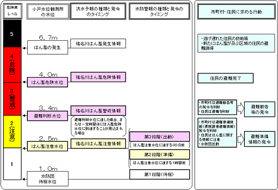 「水防警報」とは、沿川の水防団や消防機関が出動するか、あるいは出動準備体制をとるかなど、実際に水防活動を実施する場合の基準となります。水防警報は小戸水位観測所の水位を基準に、第1段階(待機)・第2段階(準備)・第3段階(出動)・第4段階(解除)の4段階で発令されます。