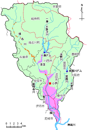 猪名川流域に大雨が降った場合、積極的に貯水させる地域から、水はけが悪く浸水のおそれがある低地まで、立地に応じた保水機能や保全対策をとる必要があります。そこで地図のようなエリアごとに、条件にかなう貯水施設を設けて対策に協力するよううながしています。