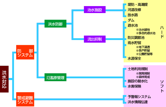 猪名川流域を洪水や川の氾らんから守るためには、ハード・ソフト両面からの対策が求められます。急な災害にもスムーズに対応できるよう、次のような流れで体策を講じていきます。