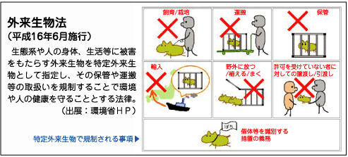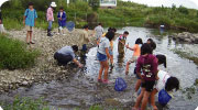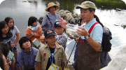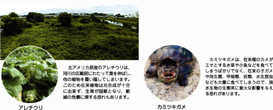 川には様々な生物が生息しています。植物は昆虫のエサに、昆虫は魚や鳥のエサになり、それらはもっと大きな魚や鳥、動物たちのエサになるというように、生き物は互いの存在によって生命を維持しています。この食物連鎖がうまく循環するためにはさまざまな生き物が共に生きていけるバランスの良い環境でなければなりません。しかし近年では今まで日本にはいなかった多くの外来生物が海外から侵入し、生物のバランスが崩れて在来の生物が減少又は絶滅の危機にさらされています。