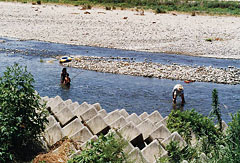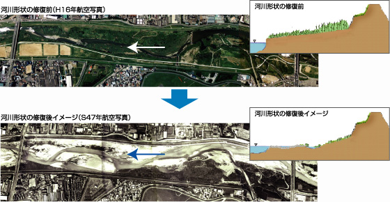 しかし近年は、これまで進められてきた河川改修などにより河原などの水辺環境の多くが失われ、景観が悪く生物にとってもすみにくい川になってしまいました。このため、乾陸・樹林化してしまった河川敷を切り下げて河原を再生するなどし、昔のような美しい環境をとりもどすための対策を実施します。