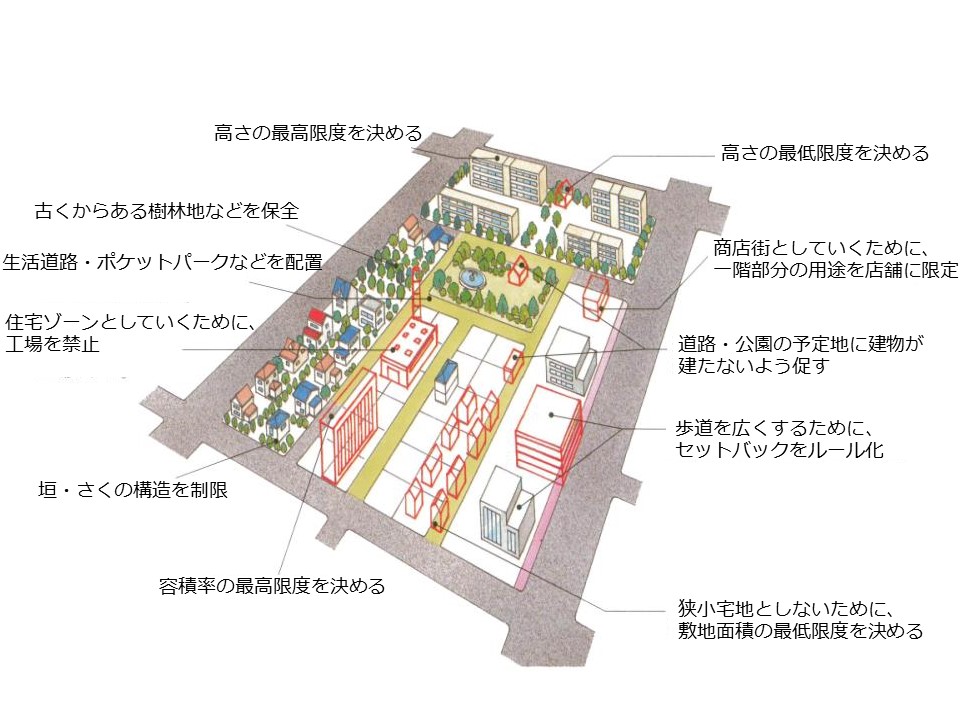 (1)地区施設(生活道路、公園、広場、遊歩道など)の配置 (2)建物の建て方や街並みのルール (用途、容積率、建ぺい率、高さ、敷地規模、セットバック、デザイン、生垣化など) (3)保全すべき樹林地 (4)都市農地の開発規制