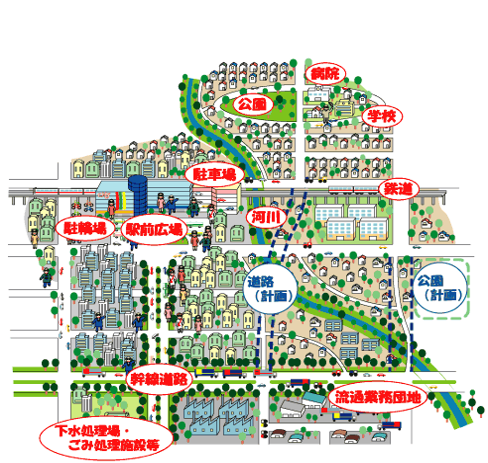 円滑な都市活動を支え、都市生活者の利便性の向上、良好な都市環境を確保する上で必要な施設を、都市施設といいます。都市施設が、都市計画において決定されることにより、その区域内に建築規制が及びます。都市施設として都市計画に定めることができるものには、次のようなものがあります。
