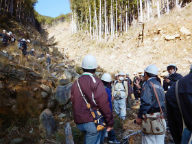 県内外から約40名の参加があり、大学研究者や工事担当者の案内で土石流現場や地域の遺構などを巡り、土砂崩れのメカニズムや地域の歴史、砂防堰堤の建設状況について紹介しました。