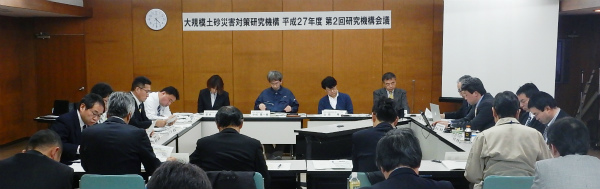 - 各機関より平成27年度の研究状況が報告され、大規模土砂災害のメカニズム解明や災害リスク評価に向け一定の成果が得られたことや、新技術を活用した対策手法の導入、住民啓発に関する取り組みなどについて情報交換が行われました。