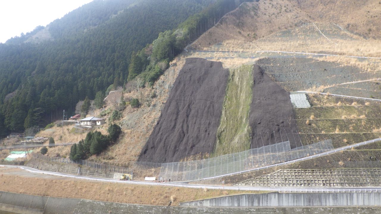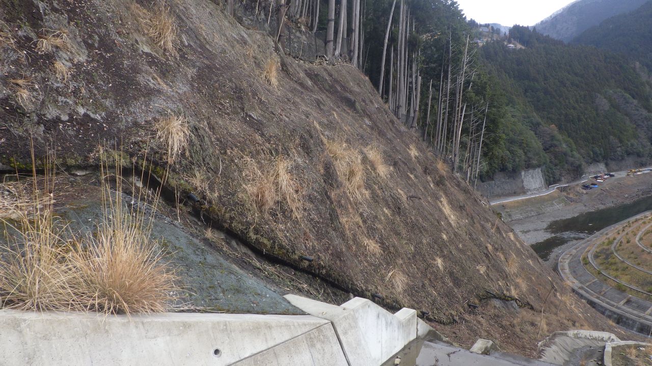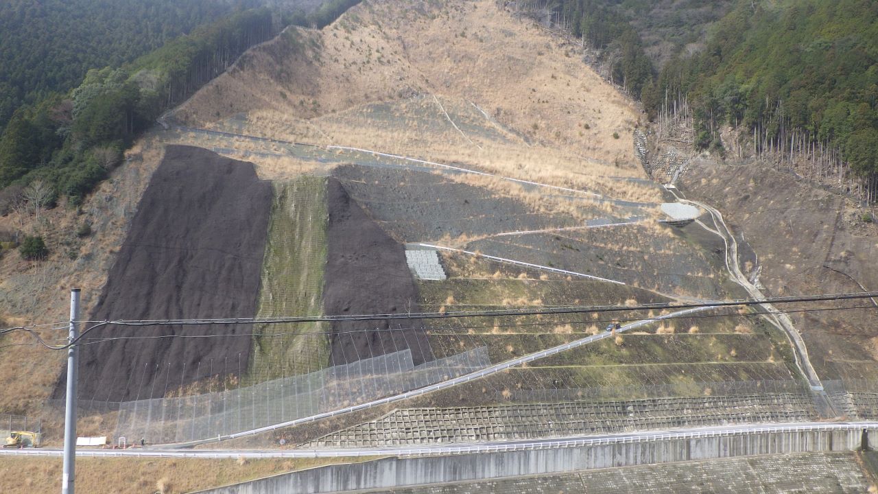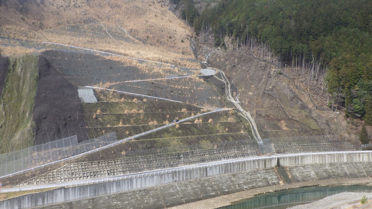 清水地区では発災当時、幅220m、高さ250m、長さ350mの崩壊が発生し約160万m3にのぼる崩壊土砂が発生しました。緊急対策工事により崩壊斜面の安定化のための整備および洪水流の安全な流下のための護岸整備が完了しました。