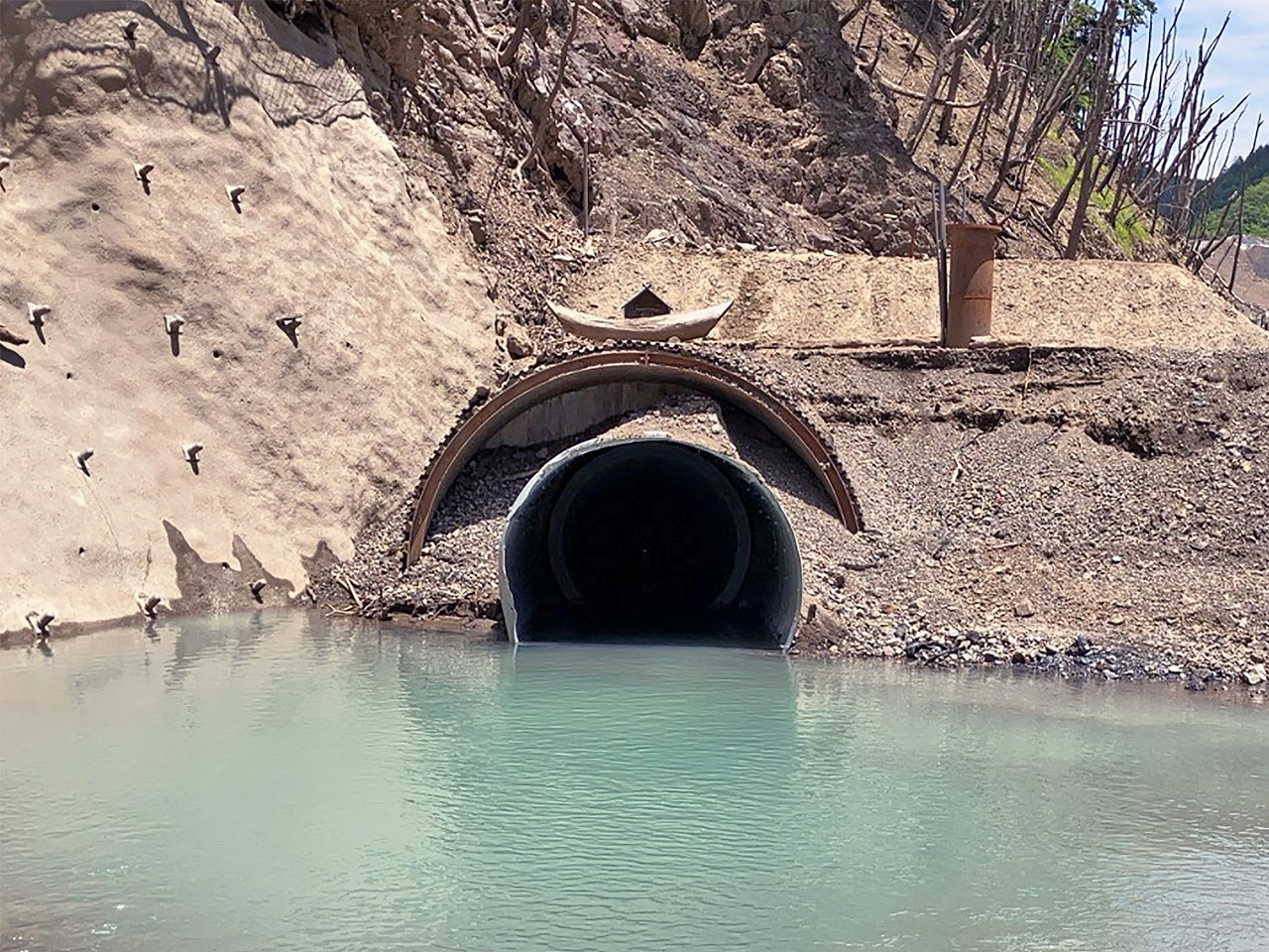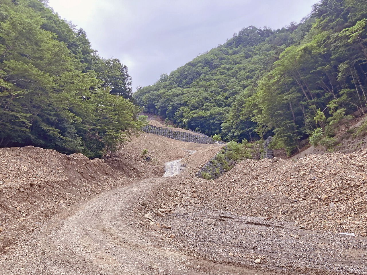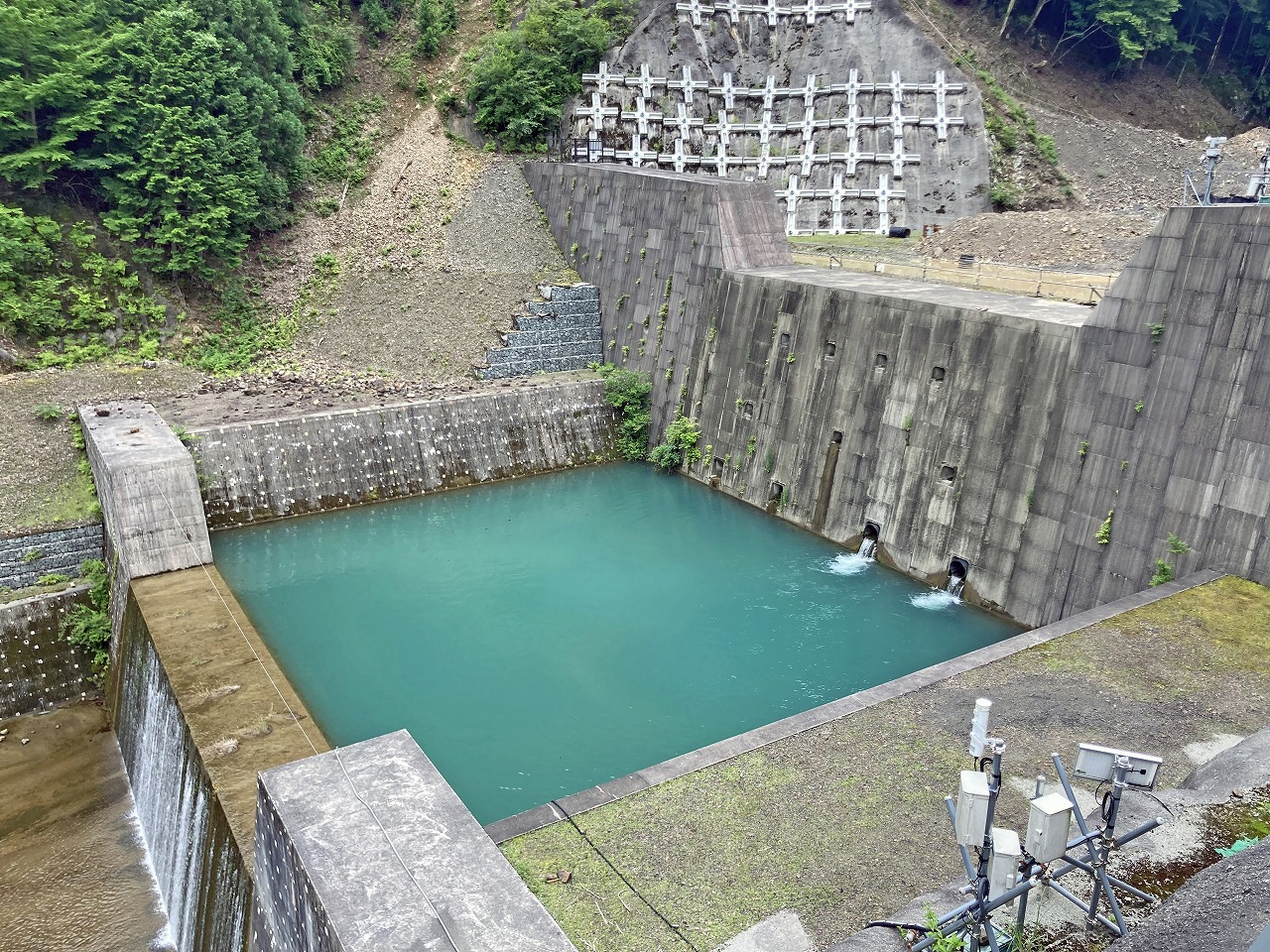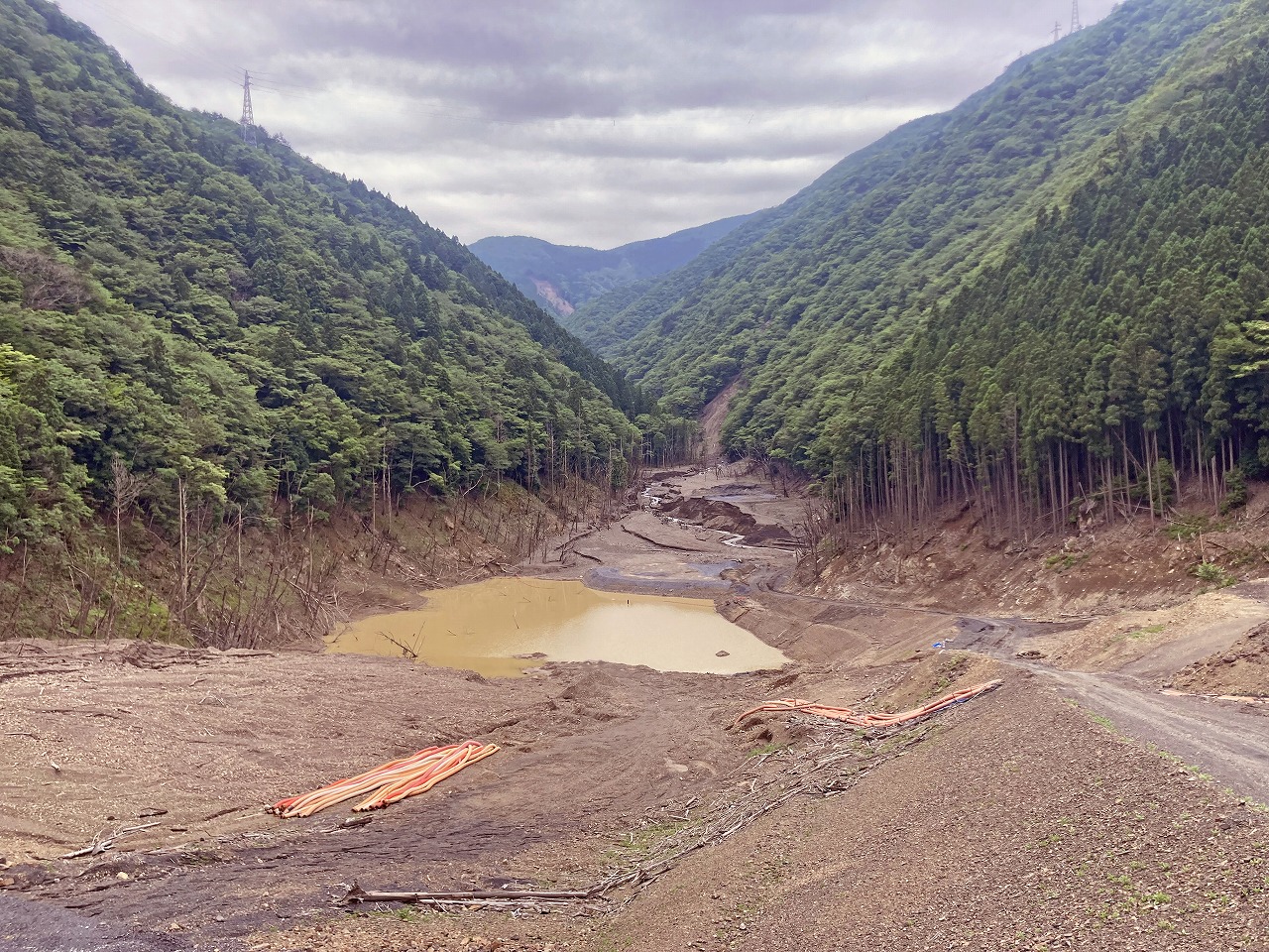 長殿地区では発災当時、幅340m、高さ400m、長さ650mの崩壊が発生しました。約595万m3にのぼる崩壊土砂で河道が閉塞し、現在も湛水池を形成しています。大雨が降ると湛水池からの越流により、河道閉塞土砂の急激な侵食をともない土石流が発生し、下流の長殿、宇宮原、上野地地区で甚大な被害が生じるおそれがあります。このため、河道閉塞土砂の急激な侵食を防止し、また河道閉塞箇所の下流に堆積した土砂の流出を防止するための工事を実施しています。