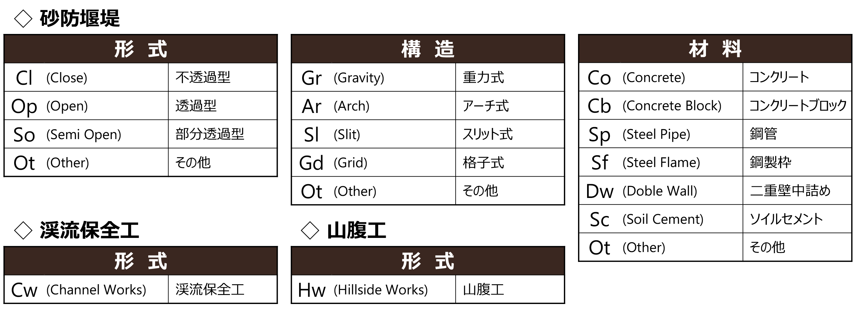 砂防施設の形式やどんな構造・材料を使用しているかを略語で表しており、砂防堰堤については形式+構造+材料の英字6文字で、その他の砂防施設は形式の英字2文字で表記しています。
