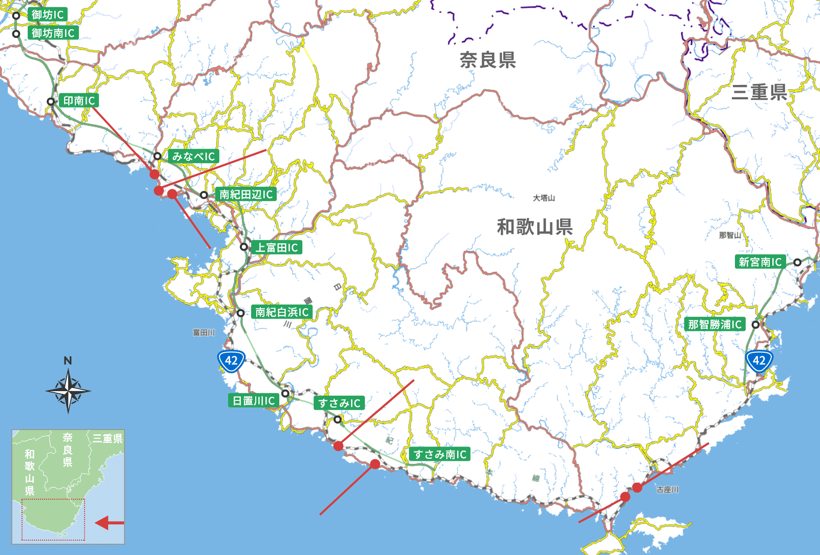 ※異常気象時等は、アクセスが集中して一時的に表示が遅くなることがあります。 しばらく時間をおいてから再度アクセスをお試しいただけますようお願いいたします。 ※道路の管理のため操作を行う場合があり、カメラの方向が変わることがあります。 道路のライブカメラ設置場所 1 2 3 4 5 6 7 道路のライブカメラ 画像をクリックすると、拡大画像が表示されます。 1 串本町西向 2 串本町姫 3 すさみ町和深川 4 すさみ町口和深 5 田辺市芳養 6 みなべ町埴田 7 みなべ町芝 画像情報は10分毎に更新されますが、システム上、回線の状況によっては更新時間が遅れたり画像情報を表示しない場合があります。 画像情報と実際の道路路面状況は異なる場合がありますので、実際に走行される場合は現地の路面状況及び交通規制の情報にご注意下さい。