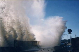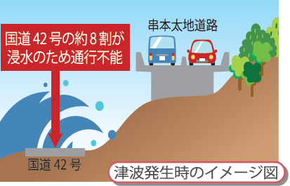 串本町から太地町までの地域では、国道42号が唯一の幹線道路ですが、急カーブなど線形の厳しい箇所や大雨によるのり面崩落、台風による越波などにより被災するリスクの高い箇所が多数あります。また、南海トラフ巨大地震の発生時には、津波により約8割の区間※が浸水し、通行不能となることが予測されています。