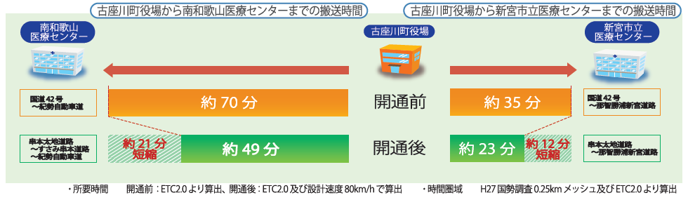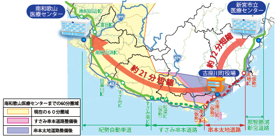 串本太地道路及びすさみ串本道路の開通により救急医療施設である、南和歌山医療センター(三次救急医療施設※)、新宮市立医療センター(二次救急医療施設※※)への搬送時間が短縮されると共に、南和歌山医療センターの60分圏域人口カバー率が拡大され、地域の救急医療活動に貢献します。