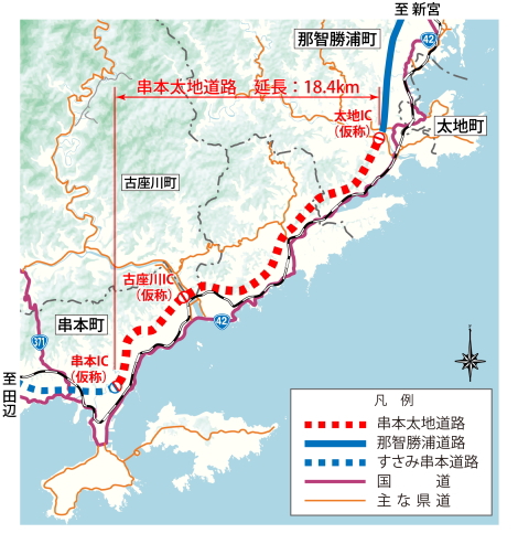 一般国道42号串本太地道路は、現在事業中のすさみ串本道路、開通済の那智勝浦新宮道路と接続し、紀伊半島沿岸部における大阪府から和歌山県南部地域を結ぶネットワークの一部を構成する、和歌山県東牟婁郡那智勝浦町八尺鏡野から同郡串本町鬮野川に至る延長18.4kmの自動車専用道路です。