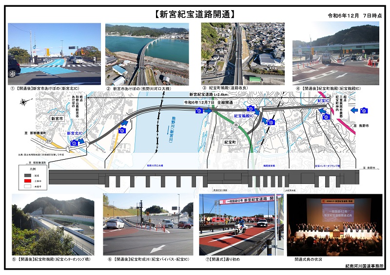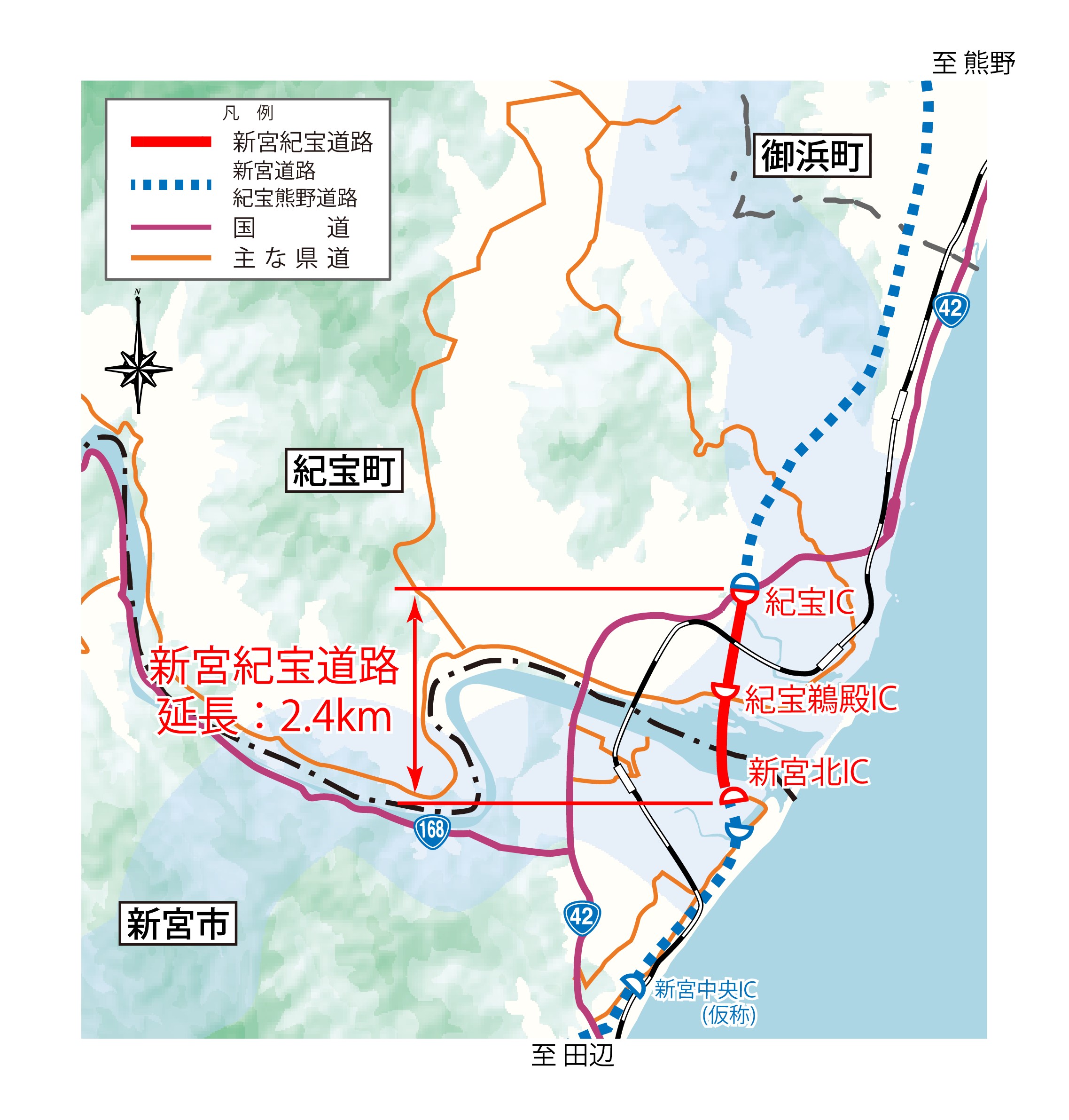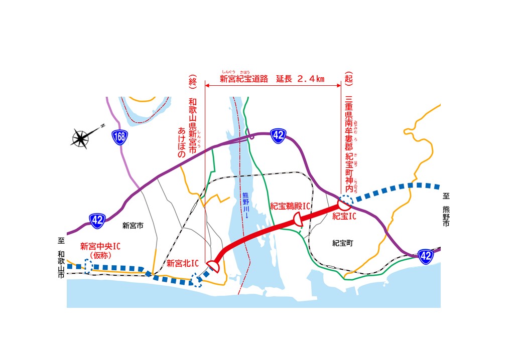 一般国道42号新宮紀宝道路(紀宝~新宮北間)は、三重県南牟婁郡紀宝町神内から和歌山県新宮市あけぼのに至る延長2.4㎞の自動車専用道路です。