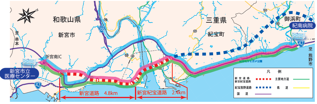 紀南病院と新宮市立医療センターは、地域の高次医療施設の中心的役割を担っています。特に新宮市立医療センターは紀南病院からの重篤患者(心筋梗塞・脳疾患・心疾患)を受け入れており、紀南病院から新宮市立医療センターへの搬送時間が短縮されます。