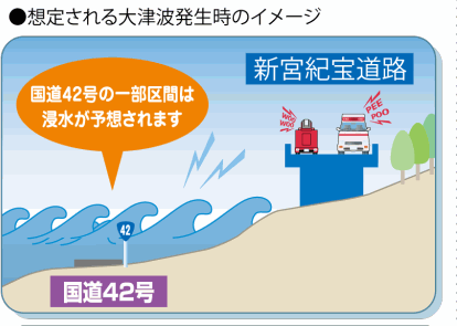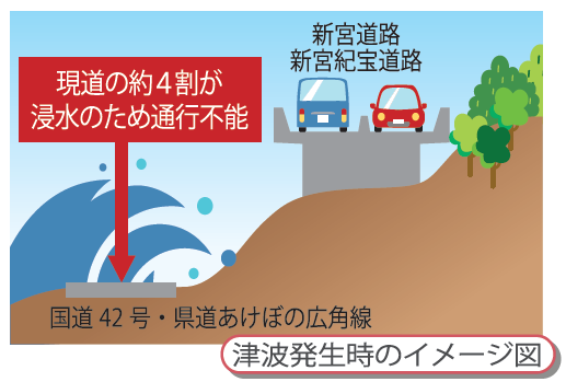 新宮紀宝道路、新宮道路の本線部は、南海トラフ地震の発生により予測される最大津波高より高い位置に計画されており、災害時の緊急ネットワークや一時的な避難場所として市民の安全と安心をの確保を図ります。